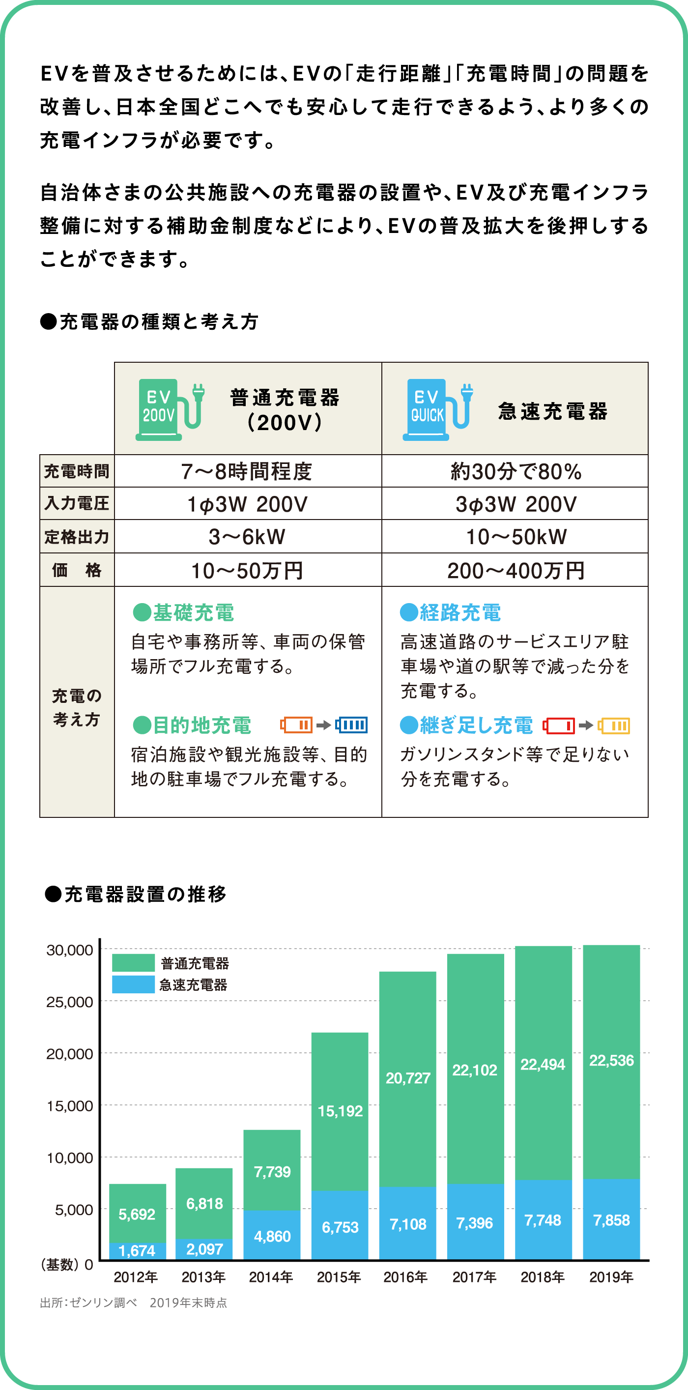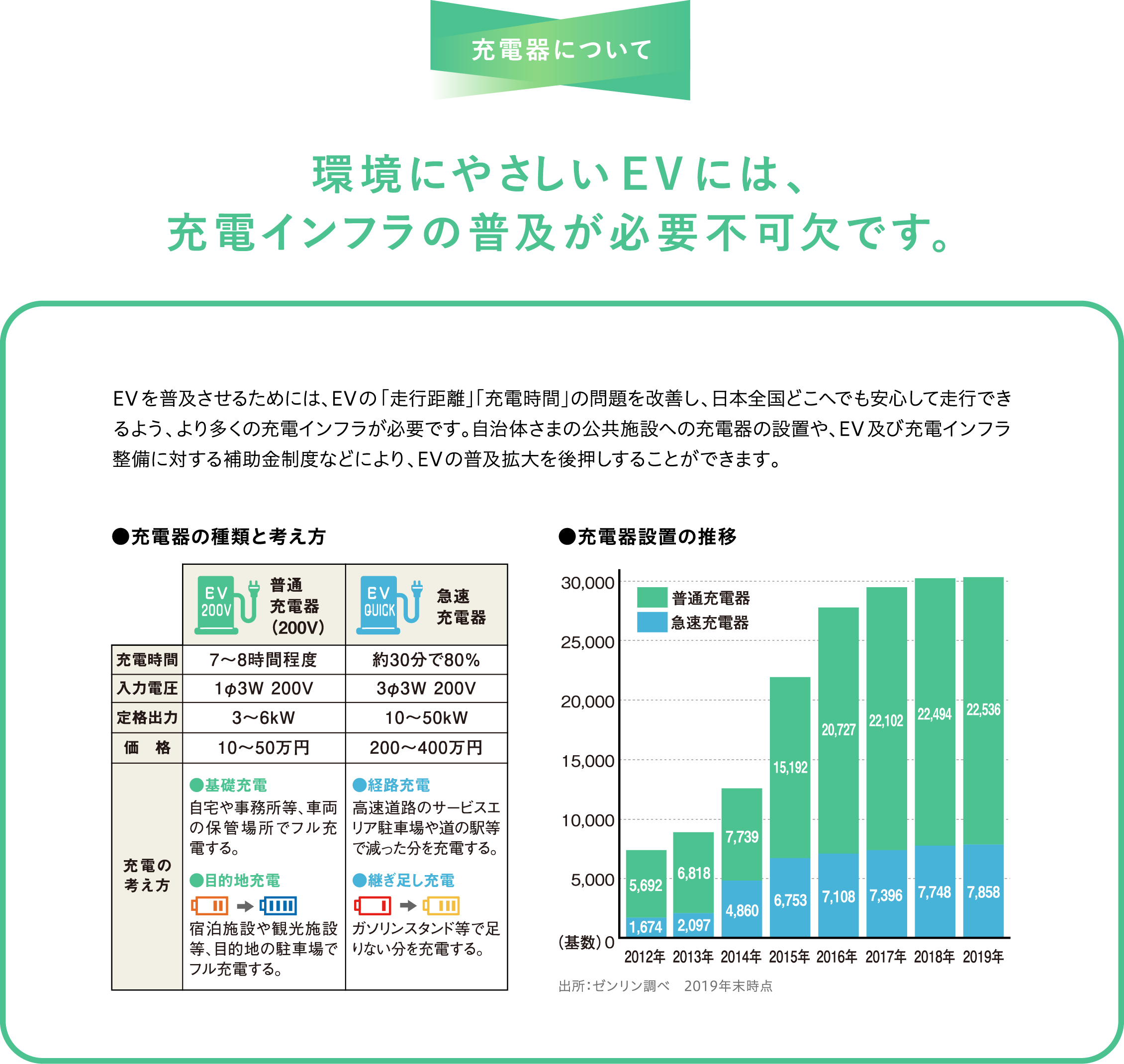 日本では、2050年の カーボンニュートラル実現のため、 2035年までに乗用車の新車販売を 電動車100%にする目標を掲げています。 これに向けて、電気自動車(EV)の 充電インフラの整備などの対策が求められています。