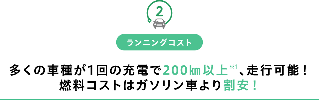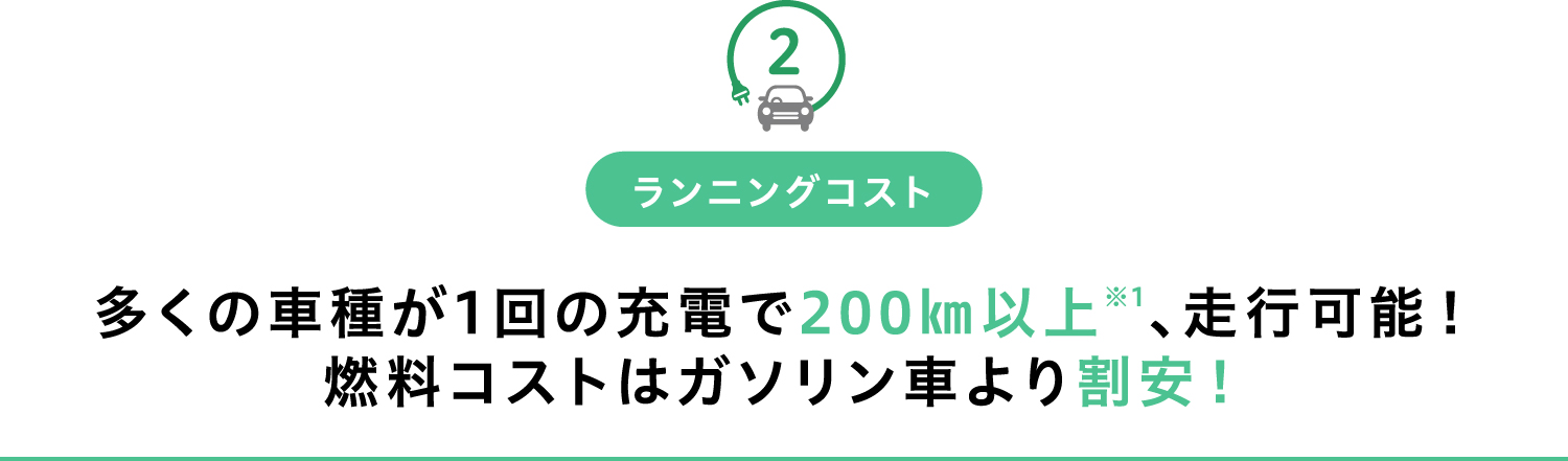 バッテリー性能の向上などで航続距離が伸び、現在では多くの車種が1回の充電で200〜600㎞※1の走行が可能に。日常で問題なく利用することができます。(一般ユーザーの走行距離:約30㎞/日)ランニングコストの面でも、電気自動車はガソリン車よりもかなり割安です。