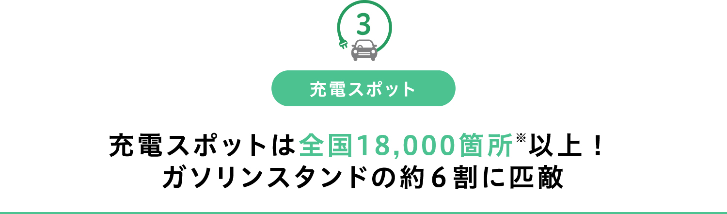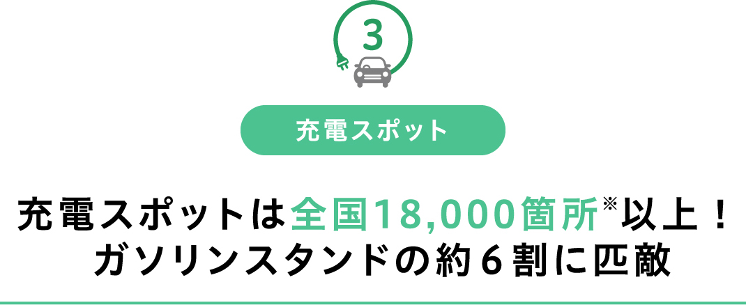 道の駅、高速道路SA、ショッピングセンター、コンビニなど、ここ数年で充電スポットは急速に拡大し、今や18,000箇所※以上にのぼります。急速充電器なら30〜60分で80%充電でき、お出かけの際の休憩時間や買い物の合間に充電できます。