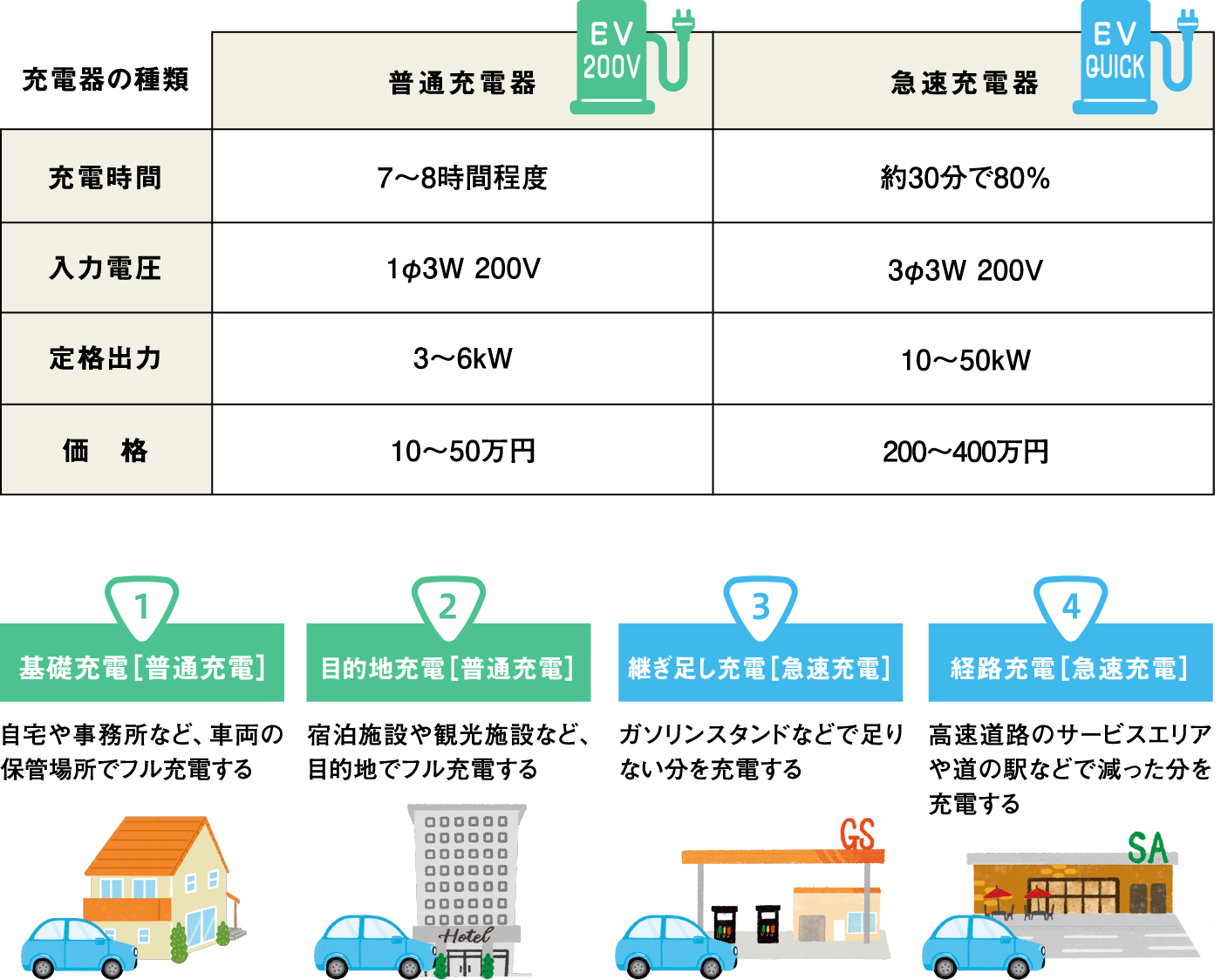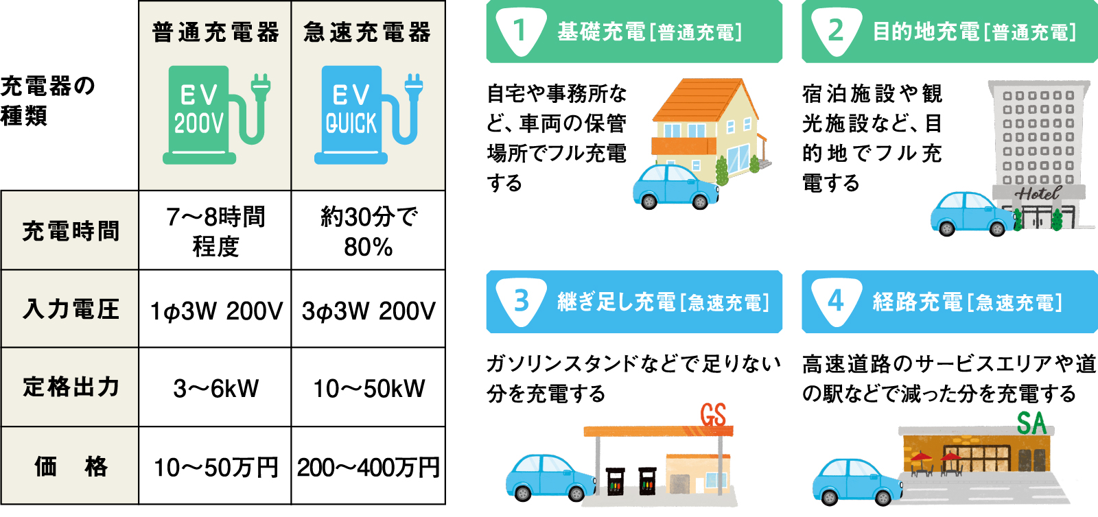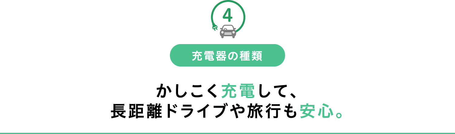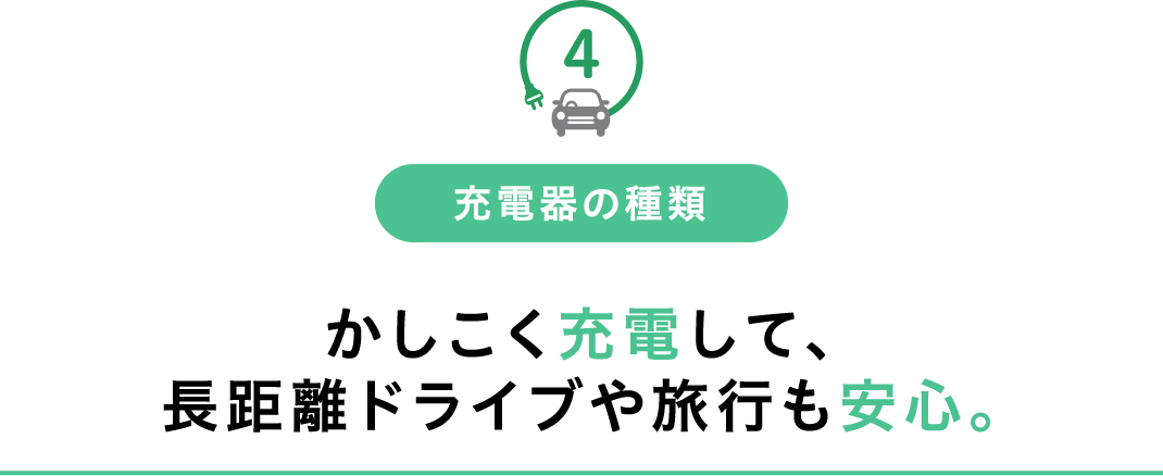 充電器の種類には、「普通充電器」と短時間で充電可能な「急速充電器」の2種類があります。充電スポットや滞在時間に合わせて充電すれば、長距離のドライブも安心です。