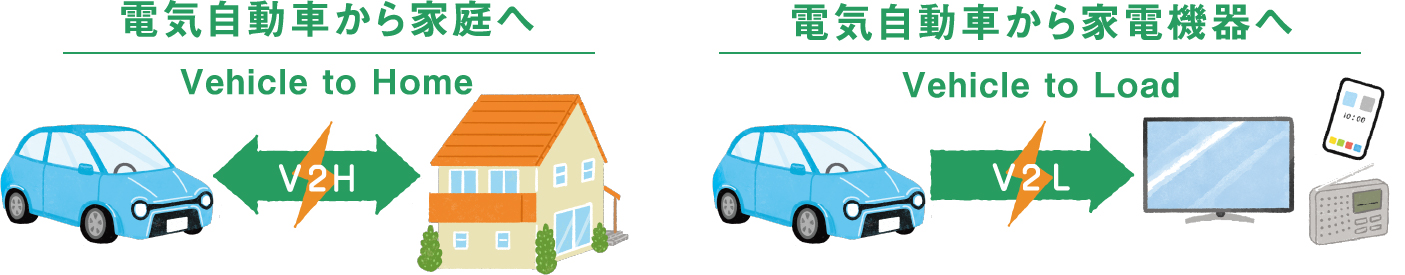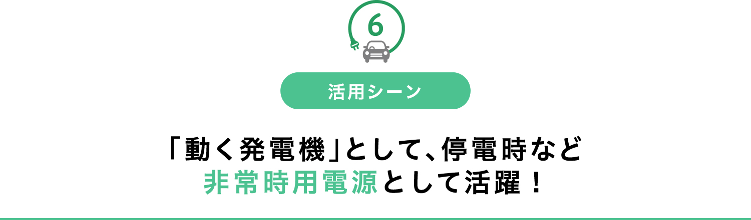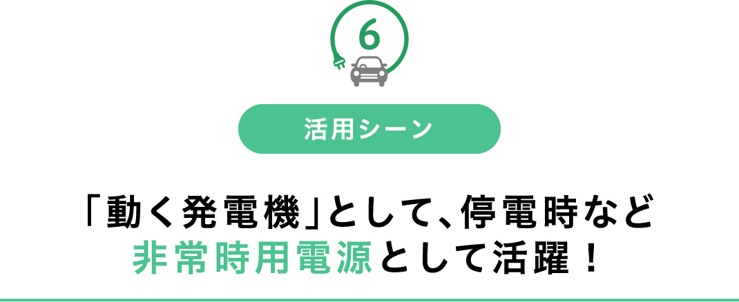 大容量バッテリーを搭載している電気自動車は、「動く発電機・蓄電池」として様々なシーンで活用することができます。例えば、災害などの非常時、家庭や避難所に電気を供給することができます。